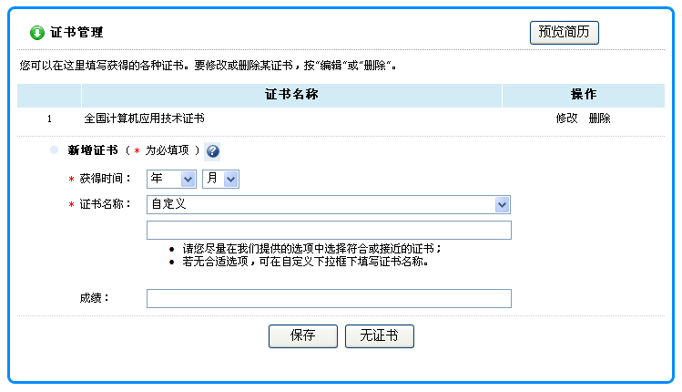 1)進入"個人管理中心",位于左側子欄目的"簡歷維護",點擊"個人證書管理"。